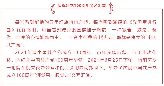 下一步,南阳医专一附一附院在校党委正确指引和院党委的坚强领导下 ,学党史、颂党恩,通过回顾历史、展望未来,把感恩党、感恩新时代的真挚情感化为奋斗建功的实际行动,续写南阳医专一附院的辉煌,向党的百年华诞献礼。