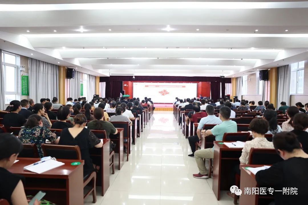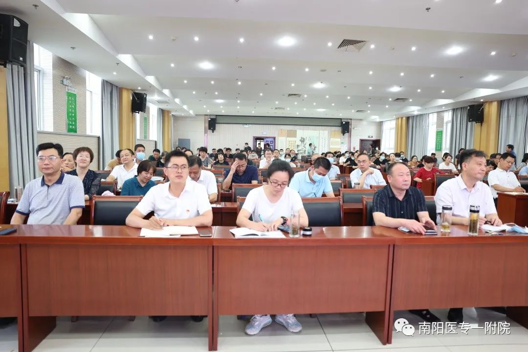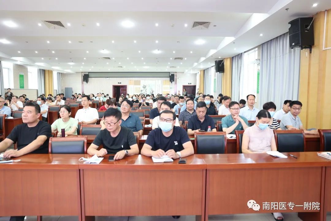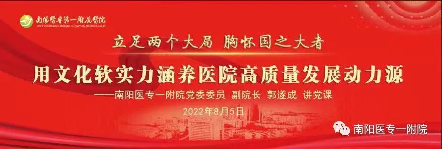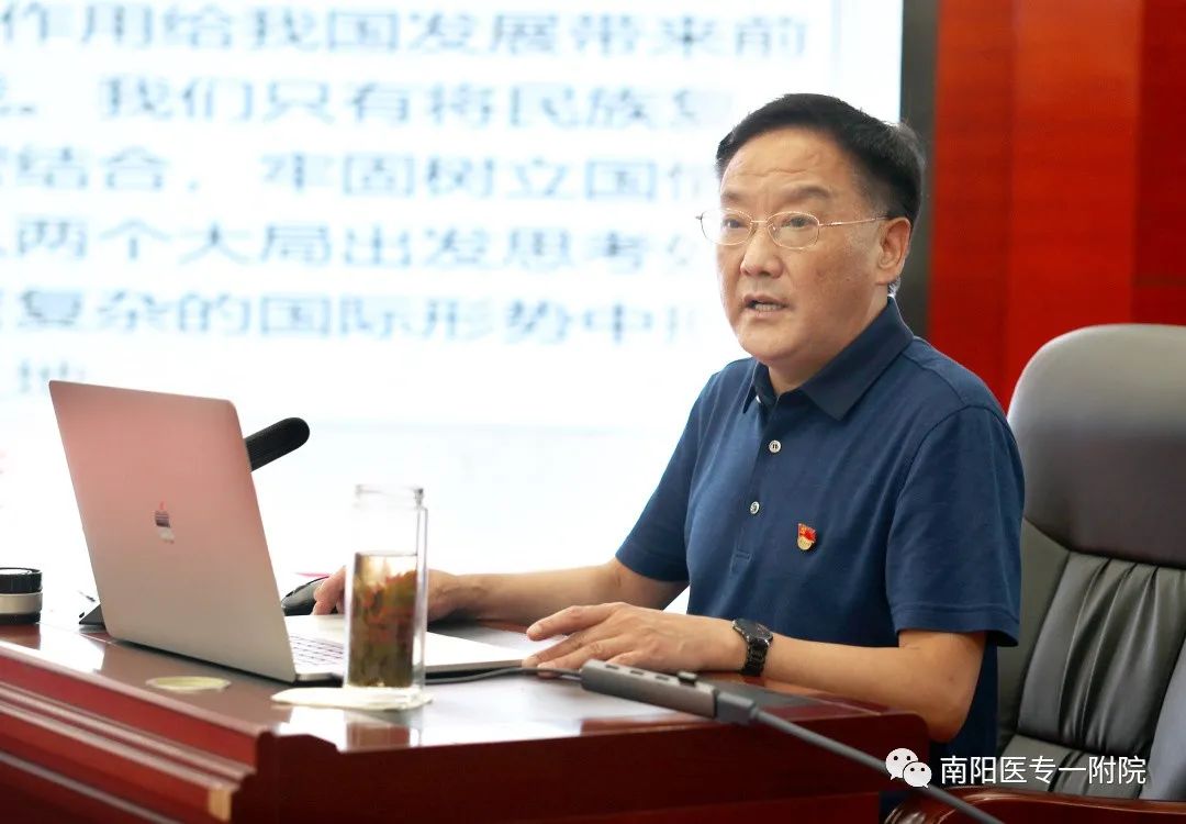 08月05日,南阳医专一附院在培训楼九楼召开会议,由院党委委员、副院长郭遂成带领大家学习党史,讲党课,向中国共产党建党101周年献礼!题目是《立足两个大局 胸怀国之大者 用文化软实力涵养医院发展动力源》。