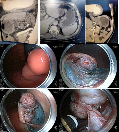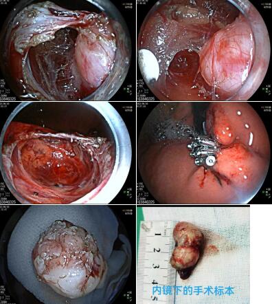 4.经内镜消化道全层切除(EFTR)治疗固有肌层或浆膜层肿瘤,其中有些直径可达5cm,瘤体完全凸向腔外,镜子需进入腹腔内分离瘤体,均安全剥离切除并分割后完整经口腔取出;