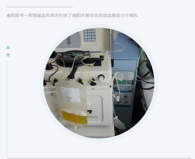 南阳医专一附院输血科率先引进了南阳市首台全自动血液成分分离机,在院党委的大力支持下,输血科牛志莹主任积极邀请相关技术专家对科室全员进行系统的理论和操作培训,目前均已熟练掌握富血小板血浆(PRP)临床治疗新技术。