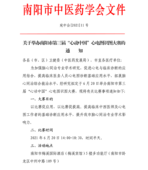 6月20日,南阳市中医药学会举办的第三届“心动中国“心电图试图大赛在梅西宾馆举办南阳市,本次比赛由全市各县区临床医师组成了24支战队,经过初赛,12支战队入围复赛。