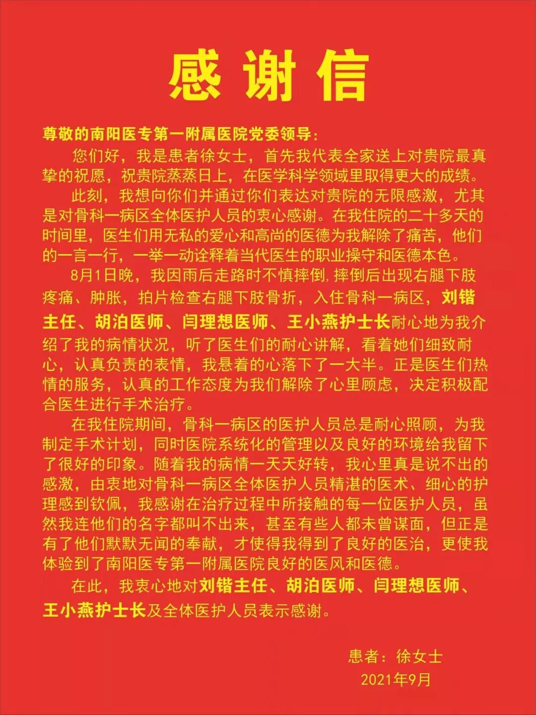 8月1日,徐某因雨天路滑不慎摔倒,造成右腿下肢骨折,入住骨科一病区。治疗期间刘锴主任、胡泊医师、闫理想医师、王小燕护士长的耐心、细心、专业,解除了患者的心里顾虑。住院期间,骨科一病区的医护人员为患者制定手术计划,帮助患者逐渐恢复。