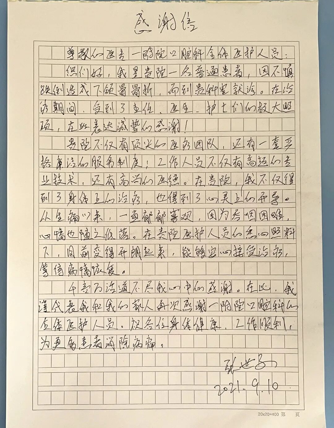 这些感谢信虽没有华丽的词句,字里行间却流露出对科室医护人员的感激之情,真挚的话语让科室医护人员感受到阵阵暖心和欣喜。患者用心写下的感谢信是对我院医护工作者工作的最大肯定,渗透出了浓浓的医患情,也传递了医患关系的正能量。