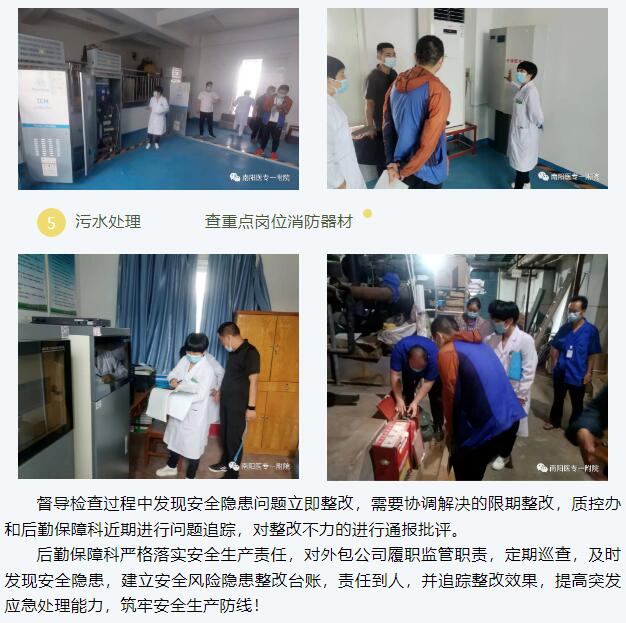 为落实我院《医疗服务能力和医疗安全提升年》活动方案,强化医院质量与安全管理,确保生产安全,于2022.6.9号上午,南阳医专一附院质控办和后勤保障科、基建办一行深入到水电气机房、电梯机房、污水处理、被服供应等后勤保障重点部门,针对安全管理、应急能力和运行维修等情况进行督导检查,排除安全风险隐患,为医院高质量快速发展提供有力保障。