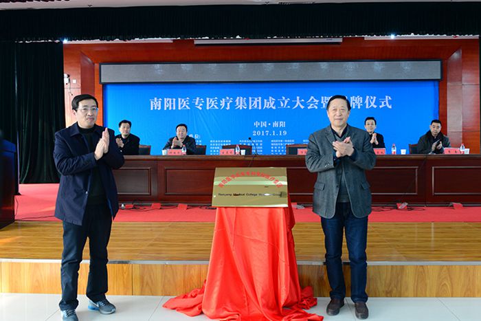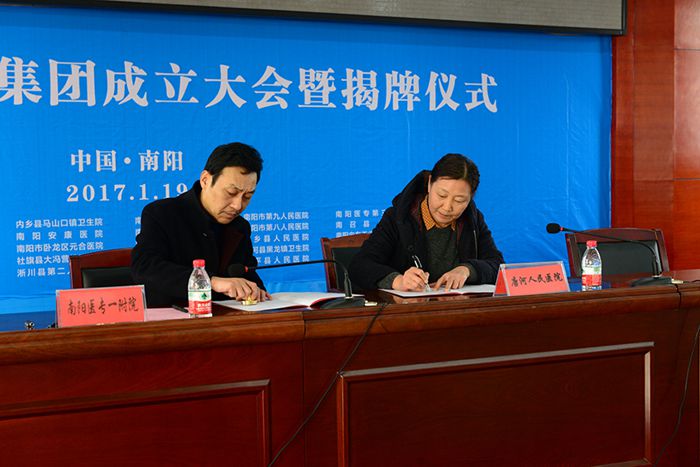 在成立大会上,南阳医专一附院副院长贾奎主持会议,并介绍了集团成立的设想筹备过程工作目标。随后,南阳卫计委副主任王志昂、南阳医专校长方家选分别致辞,并隆重揭牌宣告南阳医专医疗集团成立。淅川县人民医院院长、南阳安康医院院长在揭牌仪式上发言祝贺。随后作为集团牵头医院南阳医专一附院院长王立义分别与集团28家医院院长签署家人集团协议书。