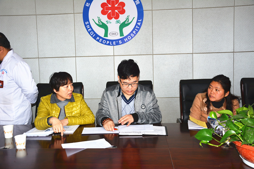 在社旗县人民医院4楼会议室,医专一附院职能科室的主任与社旗县人民医院及专程前来学习交流的集团成员单位淅川县第二人民医院职能部门的30余名相关人员一一对接,开始分头沟通、交流学习资料、文件,大家一起讨论、交流、学习医院等级评审的核心条款和资料。并走进临床一线科室进行实地观摩。