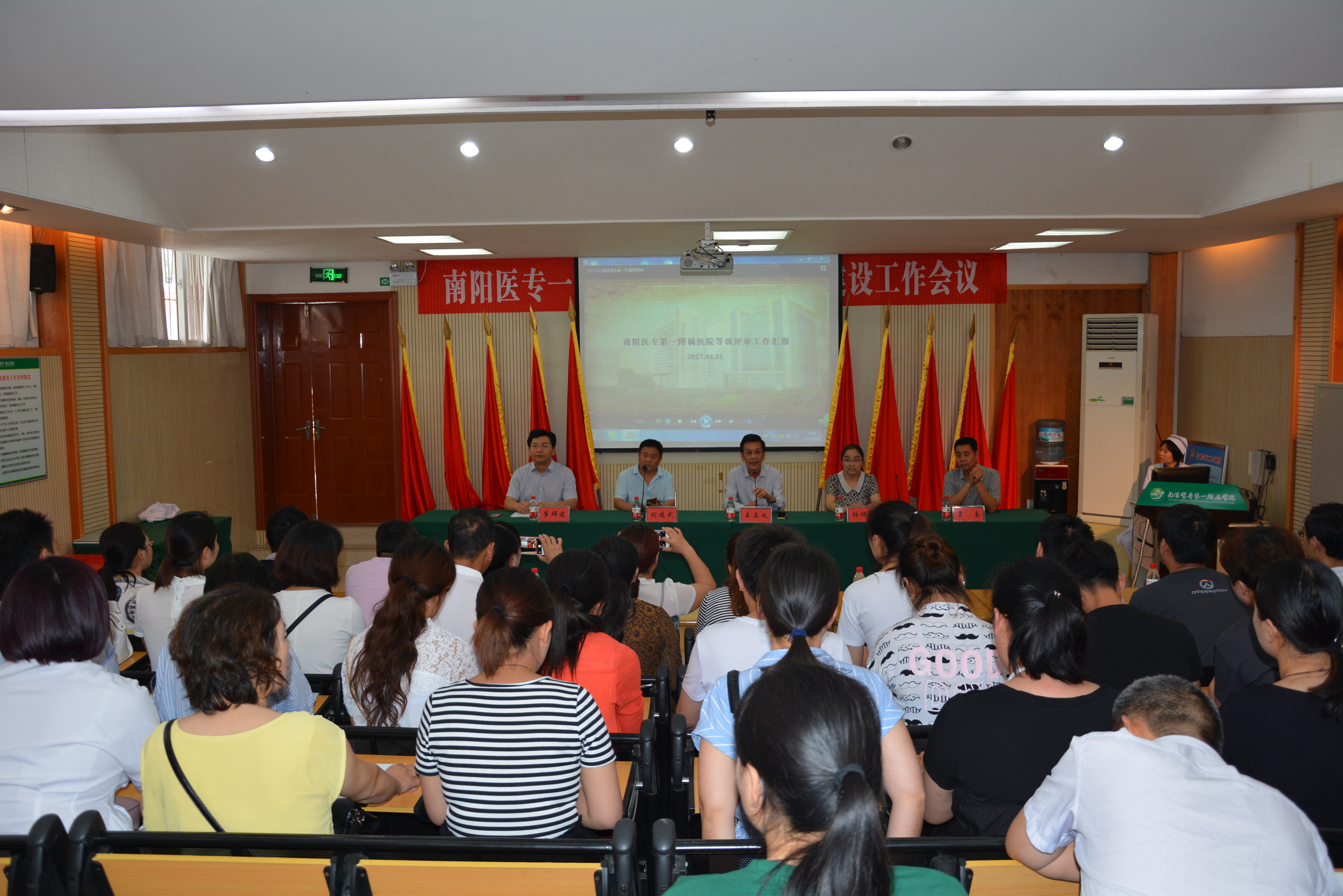 贾奎副院长与淅川县第二人民医院的同仁分享了医院在等级医院评审工作中的经验。并和大家一起观看了南阳医专一附院在等级医院评审中的宣传片。