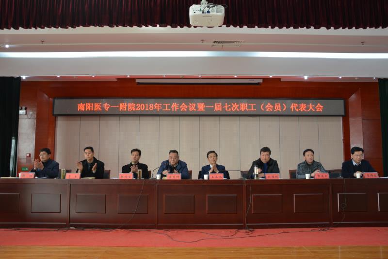 (办公室)2月10日上午9点整,伴随着雄壮的国歌,南阳医专一附院2018年工作会议暨一届七次职工(会员)代表大会在医院培训楼9楼会议室隆重召开,校党委委员、副校长逵应坤同志及医院领导班子成员出席会议,全院各科室中层、职工(会员)代表、机关科室全体人员和临床医技科室非值班人员参加会议。