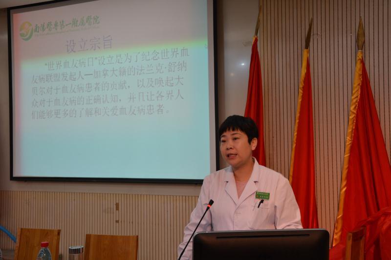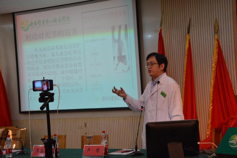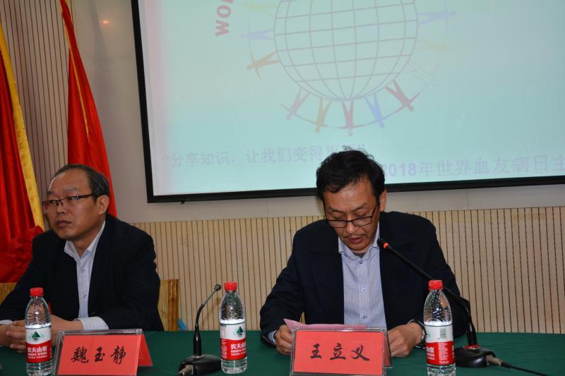 活动仪式由血液科副主任党惠兵主持,王立义院长发表重要讲话。对来自南阳市、县、乡的血友病患者及其家属的欢迎。王院长指出,血友病是一种罕见的遗传性凝血障碍疾病。血友病可引起出血时间延长或者自发性出血,尤其是肌肉、关节和内部器官出血,导致剧痛、严重关节损伤、残疾、甚至死亡。病魔虽然无情,但是我们党和各级领导非常关爱广大的血友病朋友,近期河南省卫生厅把血友病等18个病种纳入城乡居民重特大疾病医疗保障范围,越来越多的血友病患者能接受到规范的治疗。为了更好地落实国家分级诊疗政策,更好地服务于南阳的血友病朋友,我院各部门负责人大力支持南阳血友病分中心的建立,尤其是以魏玉静主任为学科带头人的血液内科团队付出了很大的努力,多次参加相关学习培训和研讨会,积极筹备和建立血友病南阳分中心。我院医保中心积极协调相关的报销流程和事项,实现了患者在院直接报销80%,减轻了患者的负担。