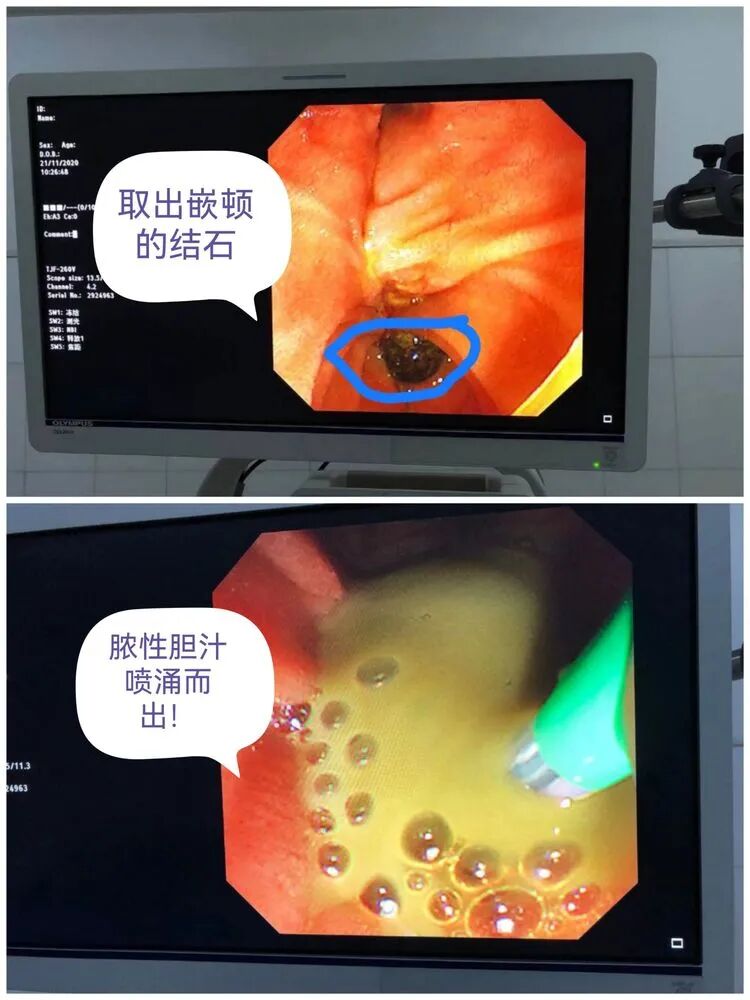 入院后完善相关检查,明确诊断后,边补液抗休克治疗,边紧急手术准备,果断行急诊ERCP手术,术中见胆总管末端结石嵌顿,胆道完全梗阻!如下图所示。