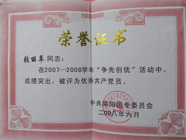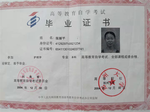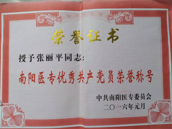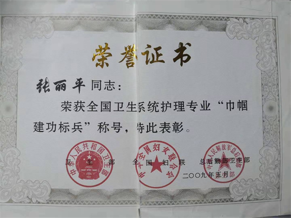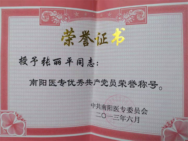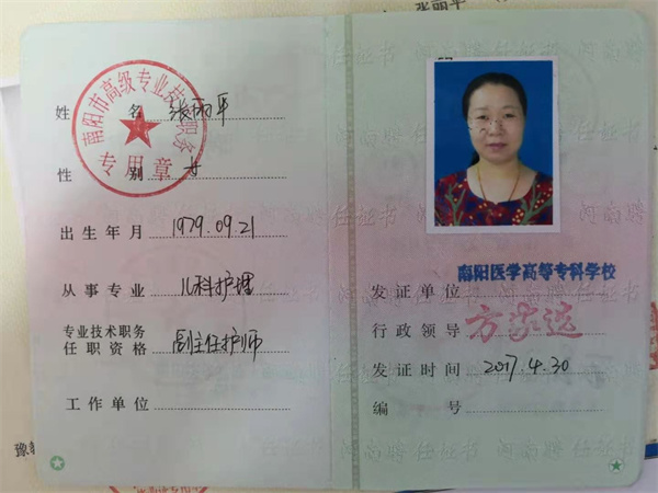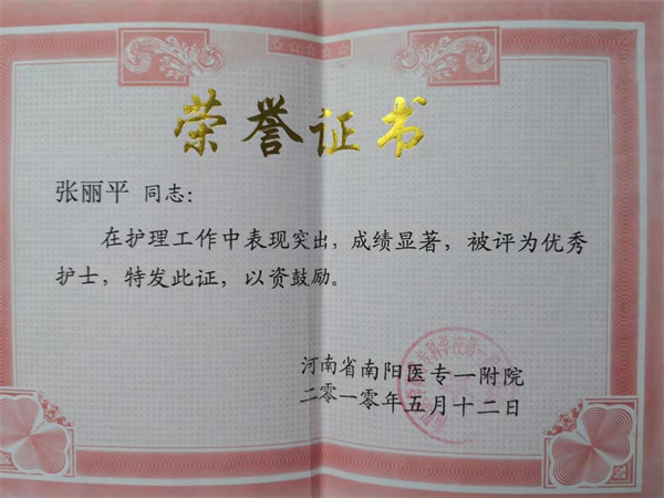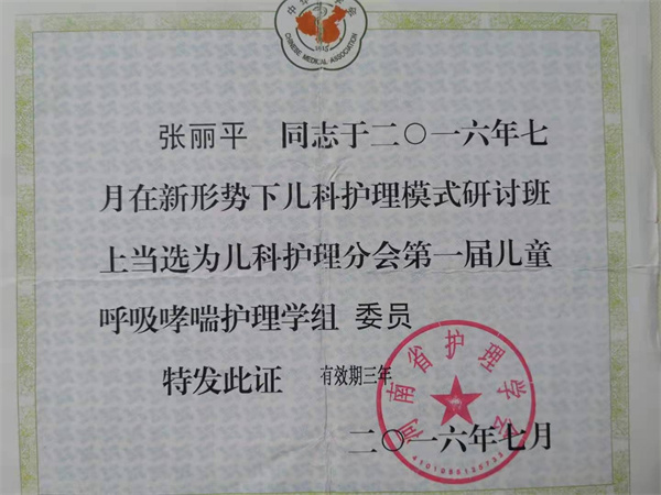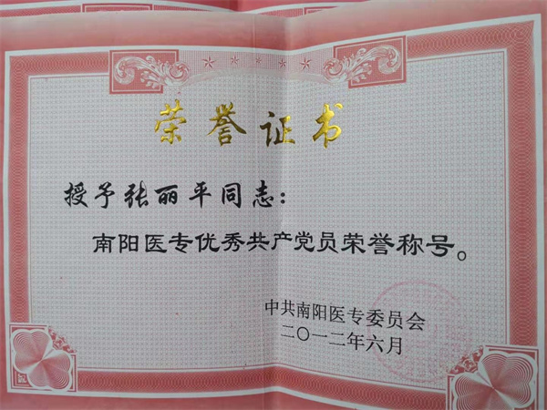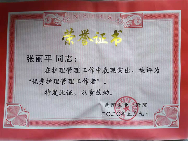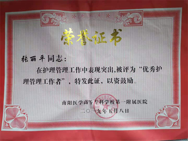 6. 张丽平,中共党员,本科学历,副主任护师,河南省儿童呼吸哮喘组委员。98年至今一直从事儿科护理工作,曾担任儿科护理教学工作,先后进修于武汉儿童医院,郑州儿童医院,参加汶川地震的抗震救灾工作,以精湛的技术,过硬的本领被当地同行和患者誉为“河南来的神针手”“玫瑰之手”等称号,被原卫生部,全国妇联,总后勤部卫生部授予全国“巾帼建功标兵”称号。被省卫生厅授予“河南省构建和谐医患关系先进个人”,共青团河南省委授予“河南省抗震救灾优秀青年”,多次被市卫生局评为“南阳市护理标兵”称号,被共青团南阳市委评为“新长征突击手”,多次被评为优秀共产党员,优秀护理管理者、先进工作者等称号。发表国家级、省级论文十余篇,SCI一篇。省教育厅自然科学研究计划项目1项,参编论著6部,发明专利1项,实用新型专利6项。带领科室护理团队,落实人性化护理,人性化管理,以病人为中心,提供高质量护理服务,严格规范操作流程,科学管理,不断提高护理质量。