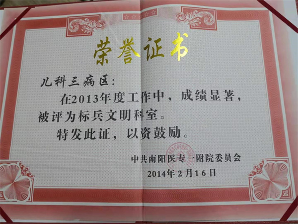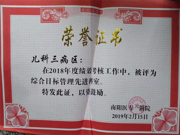 5. 儿科三病区护理团队共有20人,副主任护师张丽平任病区护士长,所有人员分别到武汉儿童医院、郑州儿童医院、郑大一附院PICU、郑大三附院进修学习,本着“一切为了患儿,为了患儿一切”的服务理念,以精湛的技术为基础,以优质服务为载体,全心全意为患儿提供人性化服务。在南阳市护理界具有一定的声誉。