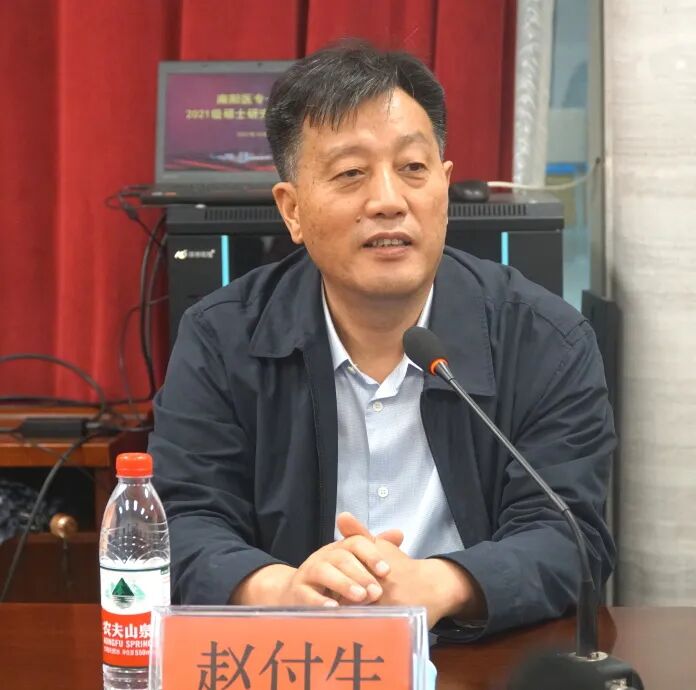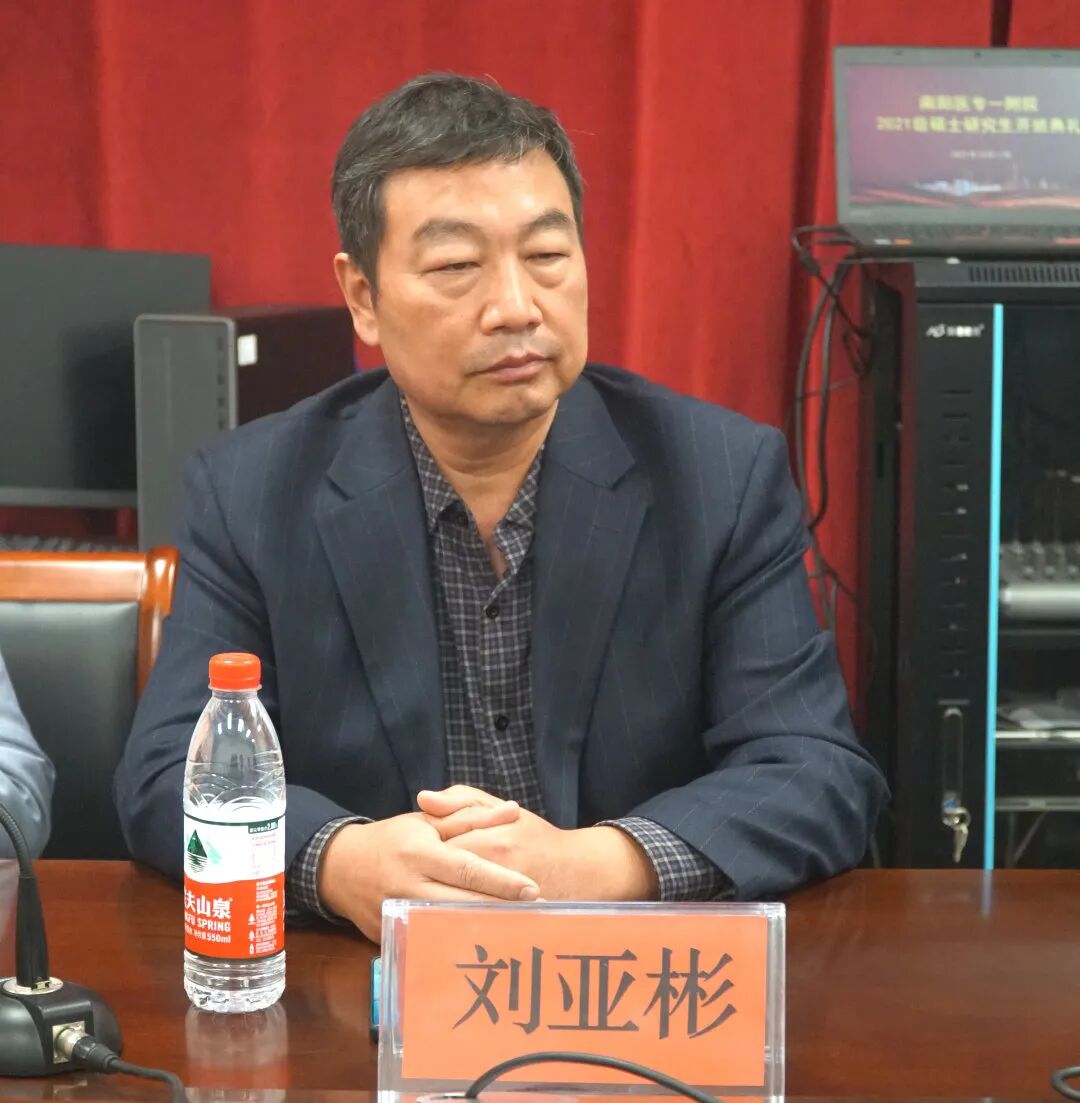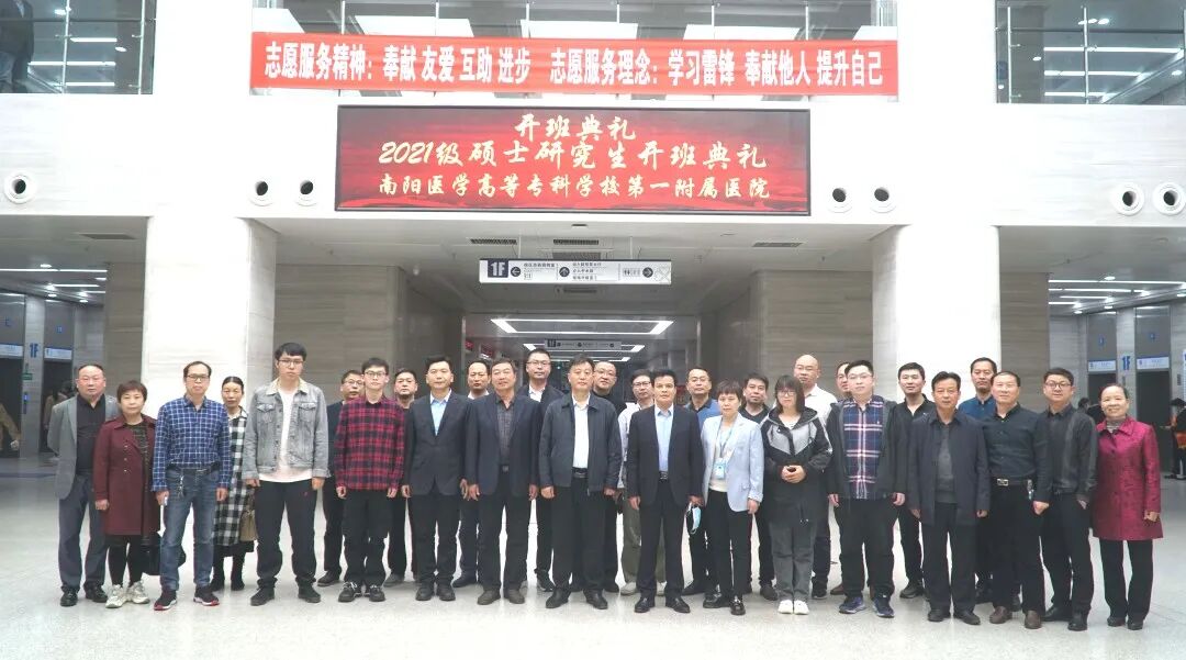 南阳医专一附院2021级硕士研究生开班典礼于2021.10.10下午在综合病房楼一楼第一学术报告厅进行。党委书记赵付生、党委副书记、院长李文献、副院长刘亚斌、院长助理于淑君和部分科室主任参加了会议。会议由院党委委员、副院长崔群建主持。